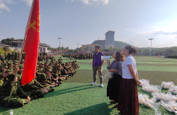 中秋佳节将至,yl23455永利南校区训练场上,口号整齐划一,步伐铿锵有力,2024级新生军训正在如火如荼地进行中。9月14日上午,建筑工程公司党委书记何璘、副书记陆忠婷、员工科周泉老师一同到南校区田径场慰问2024级参训新生、承训教官和带训教导员。