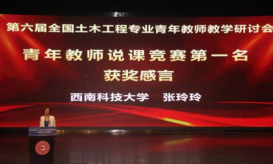 说课竞赛的决赛由教育部土木工程专业教学指导分委员会组织实施,分委员会专家和员工代表组成评审团,从教学内容、方法创新、技术融合等维度打分,华南理工大学季静教授、武汉理工大学谷倩教授进行现场点评。最终,西南科技大学张玲玲老师脱颖而出,斩获第一名。